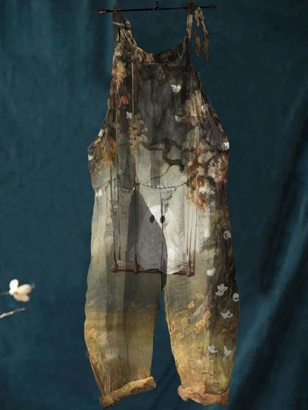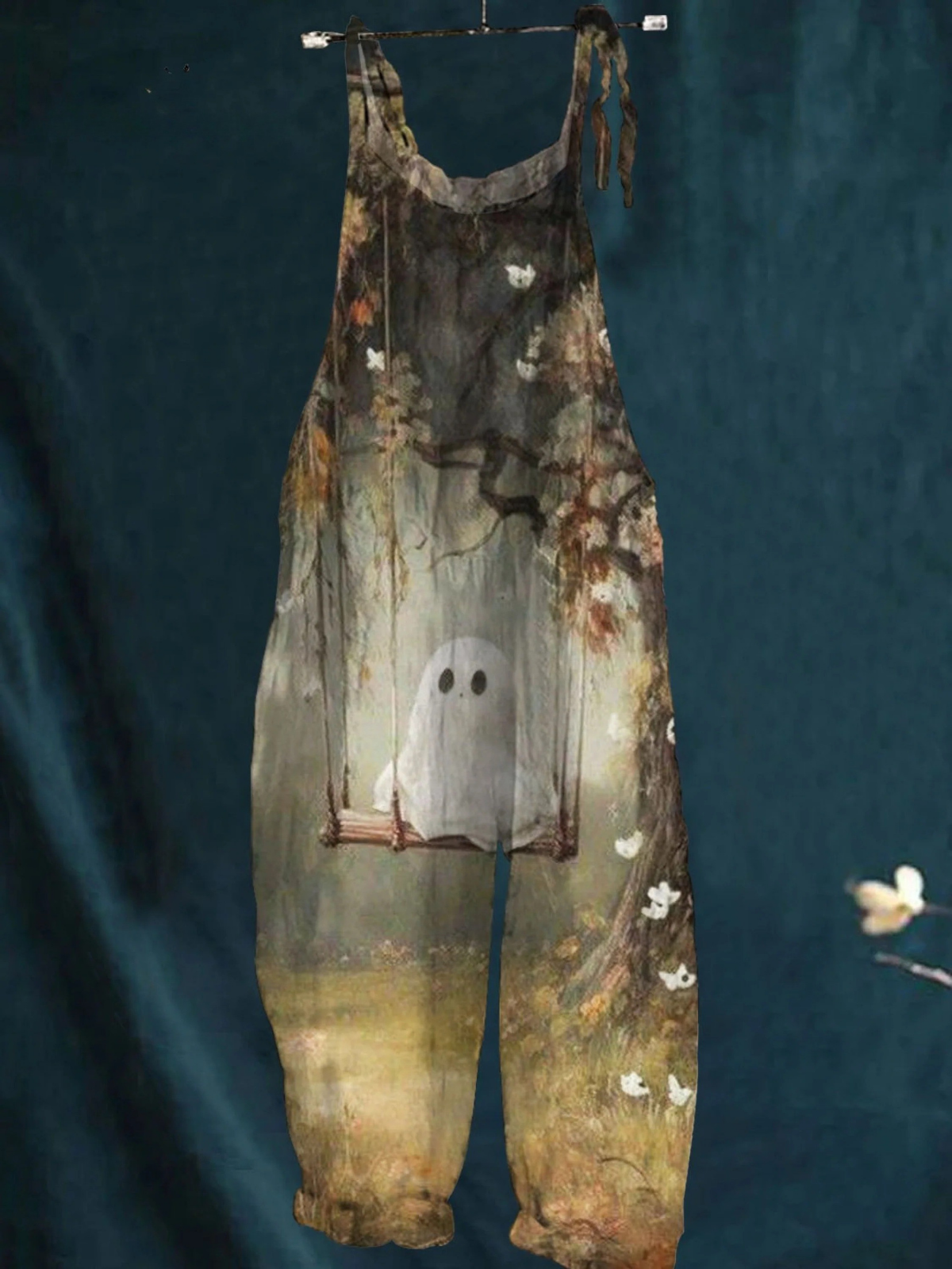 Women's Vintage Lovely Ghost Art Print Casual 100% Cotton Wide Leg Jumpsuit